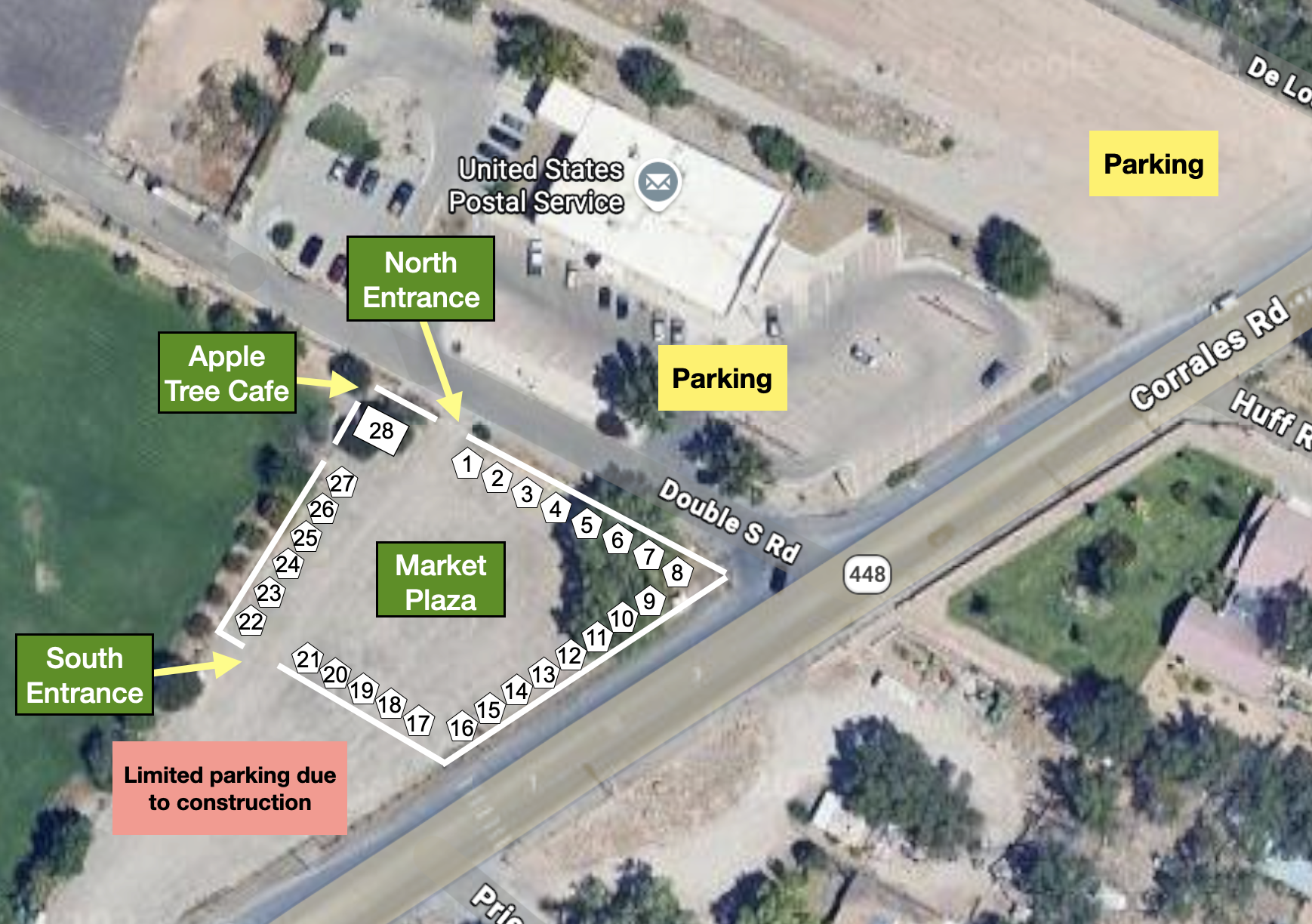 We are located on Corrales Road, just south of the Post Office. Parking is available on either side of the market, both in the Post Office parking lot and attached gravel lot. there is also more parking at the Corrales Recreation Center and Top Form Arena at the back of the Rec Center.